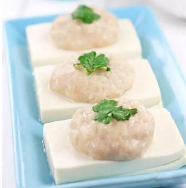 魚泥豆腐:草魚半條,去除頭尾魚骨,魚皮,洗凈剁成魚泥,然后將剁好的魚泥放到一個(gè)碗里,加入一個(gè)雞蛋清和姜末,攪拌一下再加入鹽、雞精、生粉、料酒、橄欖油、清水然后攪拌均勻,蒸鍋裝水燒開,然后把豆腐切成小方塊,放到蒸盤上,把魚泥捏成球狀稍稍按扁放到豆腐上,最后把裝好豆腐和魚丸的蒸盤放入蒸鍋中,大火蒸20分鐘即可。蒸好后在魚丸上面撒些芹菜或者蔥花作為修飾,色香味俱全。