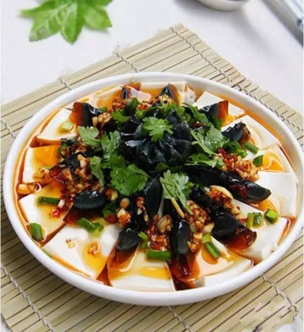 皮蛋拌豆腐:將油鍋燒熱,放入花椒炸出香味,撈出花椒留著花椒油,把嫩豆腐切片,擺放好在盤中,皮蛋洗凈切丁,放置在豆腐中央,取一小碗,加入鹽、味精、醬油、白糖、倒入花椒油調(diào)勻么成汁,最后澆淋在裝有豆腐和皮蛋上面,再淋上點(diǎn)辣椒油和香菜即可。